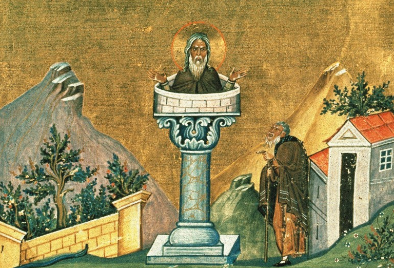 Странно житие свое сотворил еси, блаженне, егда видя народ мног, грядущ к тебе, уразуме, яко чтут и прославляют тя. Славы убегая, смирение же возлюбив, на столпе высоцем пребывати благоволил еси и, яко по степенем лествицы к небесней высоте восходя, и мраз, и дождь, и зной палящий претерпевая, Господеви непрестанно пел еси: Аллилуиа.