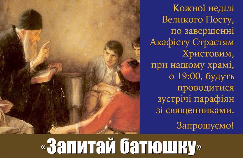 Кожної неділі Великого Посту, по завершенні Акафісту Страстям Христовим, при нашому храмі, о 19:00, будуть проводитися зустрічі парафіян зі священниками.